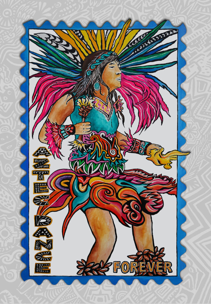 El diseño del póster honra la danza azteca con plumas vibrantes, vestimenta ceremonial y sonajas. Alrededor de la bailarina, un marco simbólico entrelaza íconos ancestrales de las culturas azteca, maya e inca—el sol, el agua, el maíz y deidades sagradas—celebrando las raíces indígenas y su conexión con la tierra.