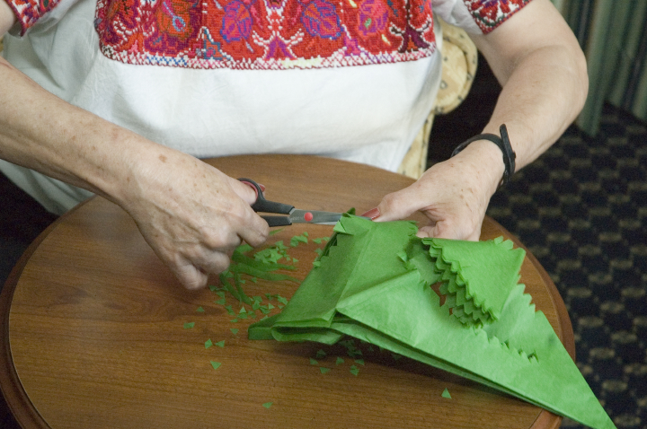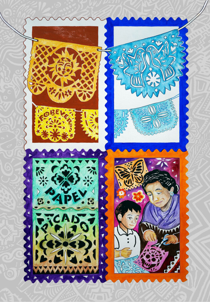 Aunque existían prácticas locales similares, el papel picado cobró nueva vida a través de talleres, exhibiciones y enseñanza directa—especialmente durante el Día de los Muertos. Los coloridos estandartes simbolizan el viento, el espíritu y la belleza frágil de la vida y la muerte, creando portales sagrados para el regreso de los ancestros.