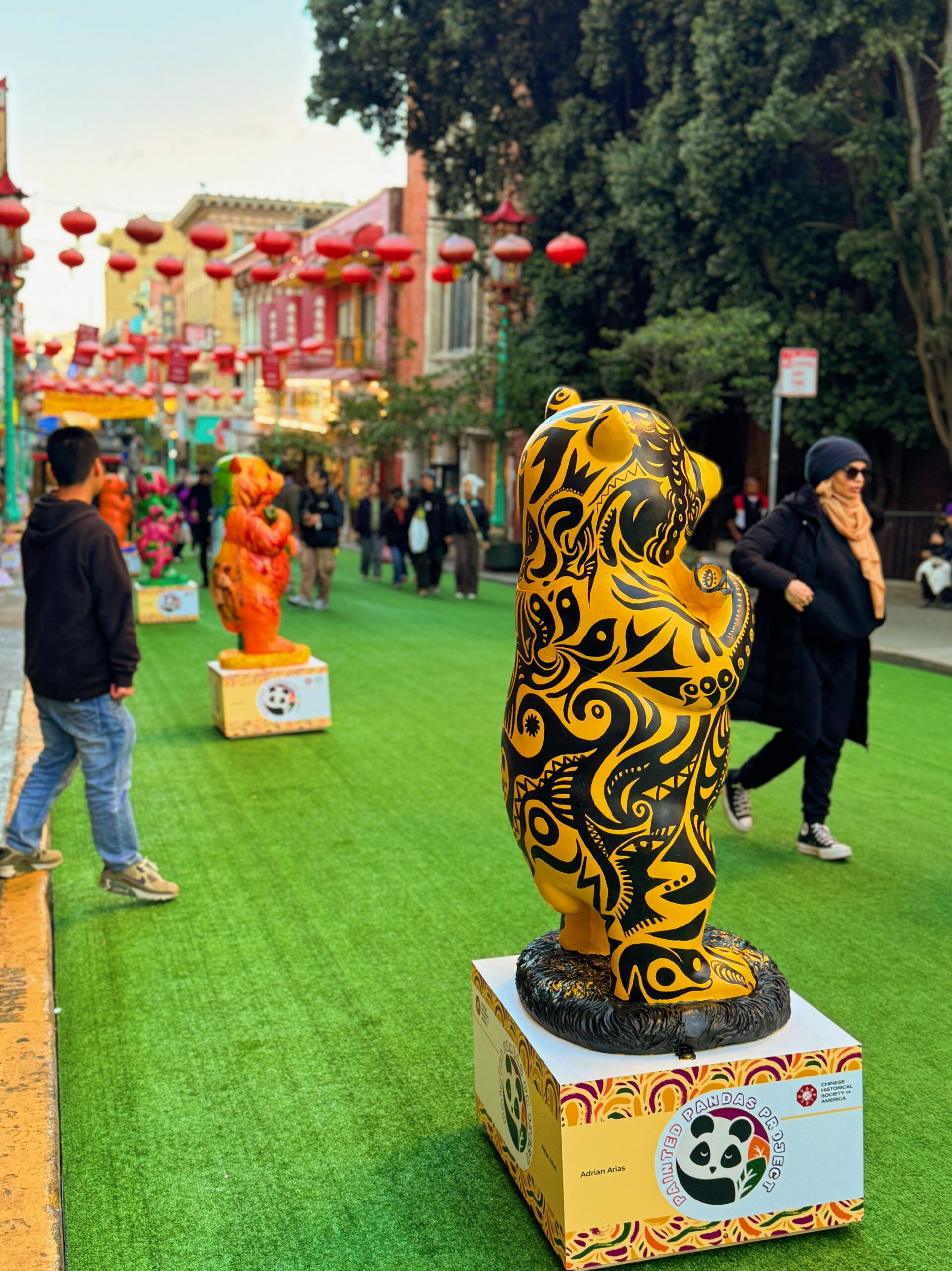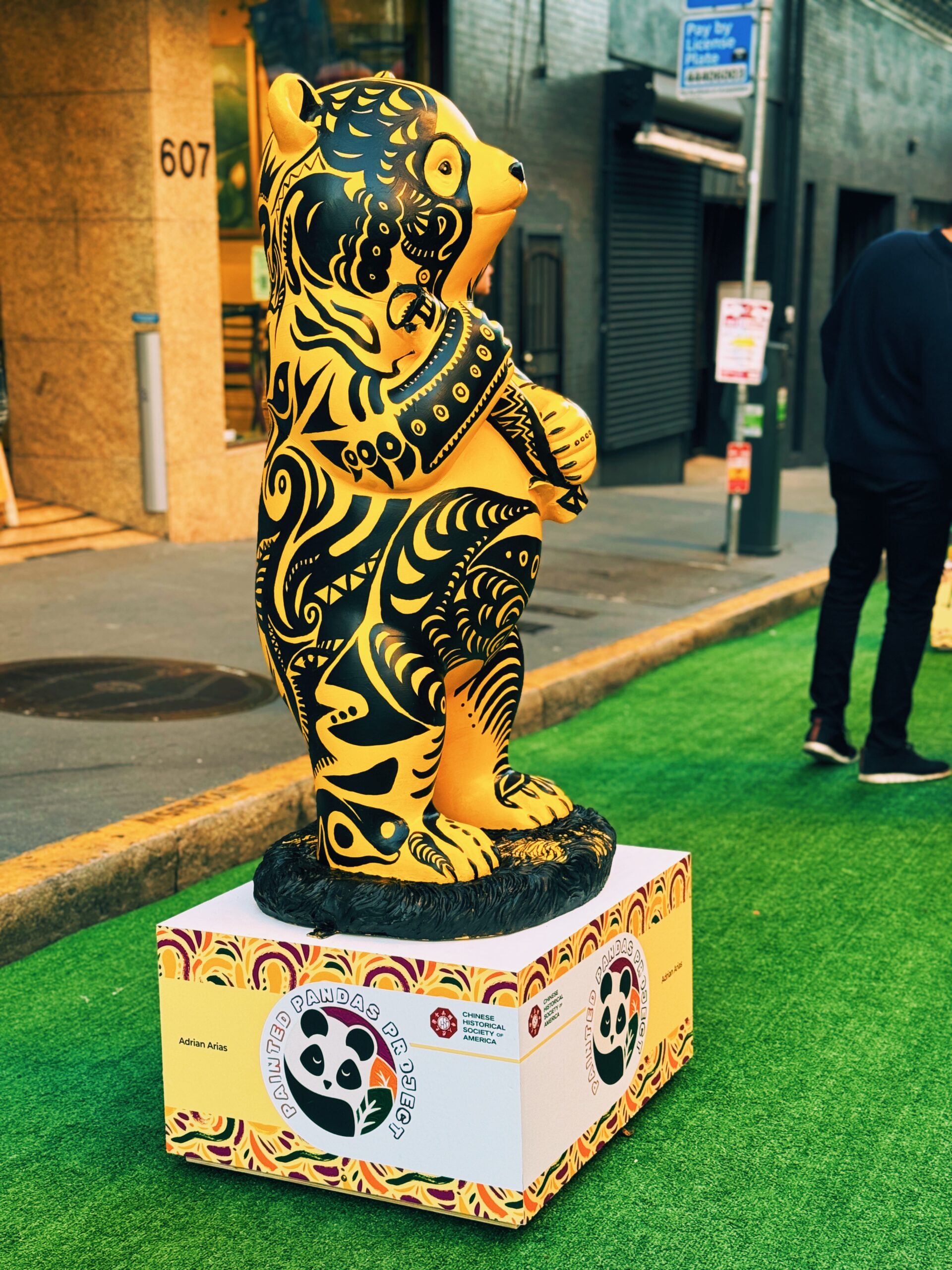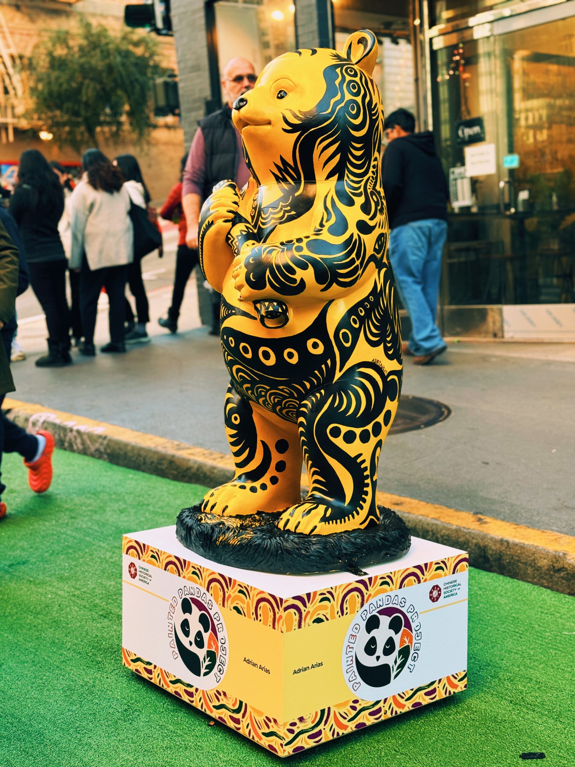 My yellow panda, covered in bold black designs, represents the universal strength and balance of yin and yang, where opposing forces come together as a harmonious whole. Through symbols of seeds, water droplets, unicellular beings, atoms, and particles, I explore the perpetual cycles of life. Inspired by the Mochica iconography of my heritage and the Ohlone culture of the land I call home, this panda becomes a bridge between past and future, inviting us to reflect on the interconnectedness and resilience that sustain our existence. Coming soon to San Francisco’s Chinatown
