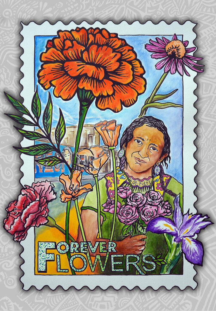 Esta imagen, diseñada con la forma de una estampilla para siempre (Forever stamp), simboliza que la presencia de las vendedoras de flores—mujeres trabajadoras, portadoras de sabiduría ancestral y corazón de la Misión—pertenece a la comunidad para siempre. En la estampilla aparece el mural con la palabra RESILIENT y el rostro de “La Doña de San Francisco”, un ícono de resistencia musical en el barrio. El mural, pintado en 2021 por Vanessa “Agana” Solari Espinoza en Mission y 26th Street, refleja la fuerza y creatividad que estas mujeres encarnan día tras día.